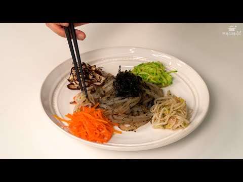접시에 버무린 청포묵을 올리고 주변에 볶은 당근, 애호박, 표고버섯, 숙주나물을 올려 완성합니다. 기호에 따라 김가루를 함께 올려도 좋습니다.